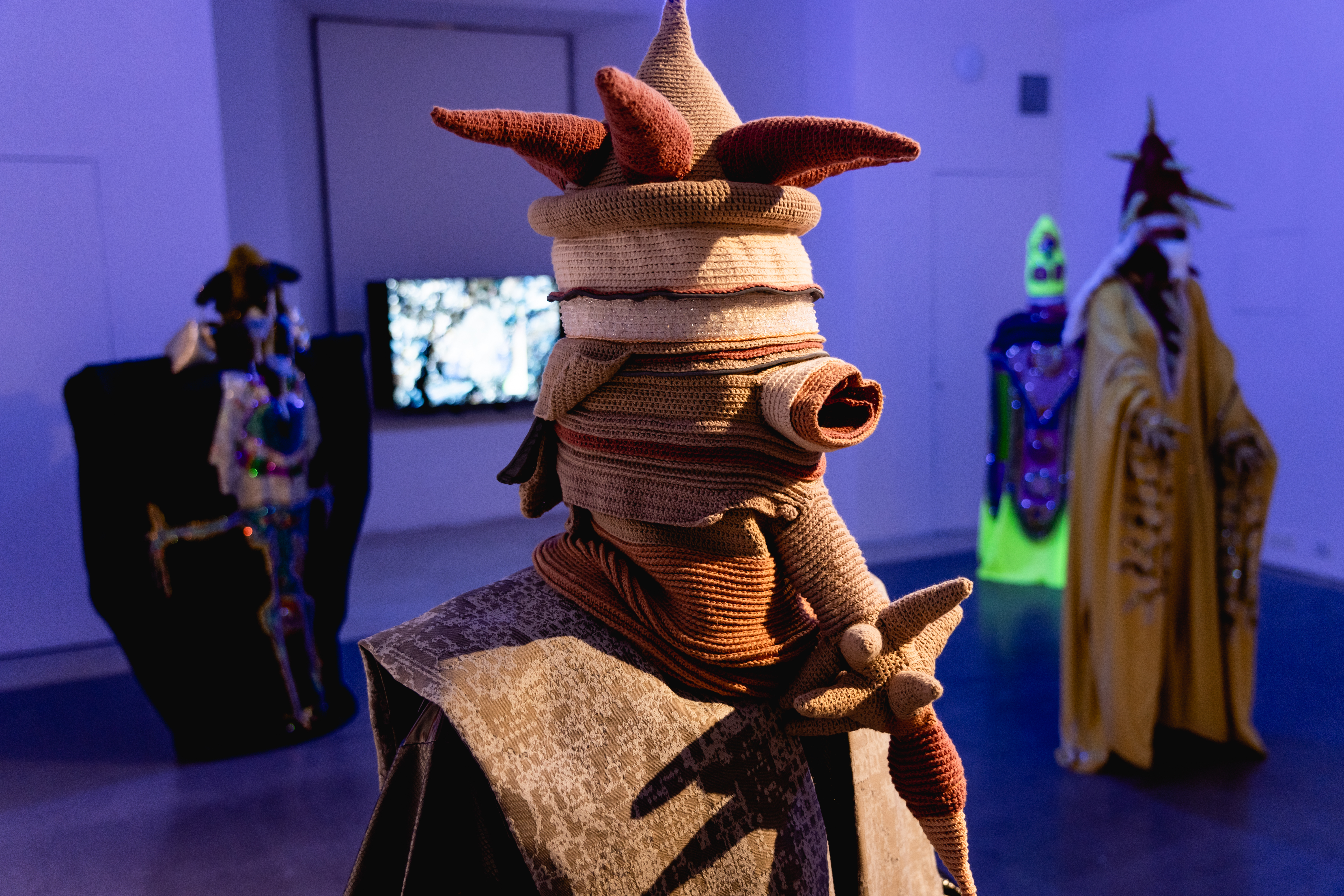 The installation on mythopoesis and constructed realities works as a cumulation of individual pieces of art created over a period of several years. The pieces are each and of themselves complete, as well as fragments of a bigger picture; an exercise in worlding and mythopoesis. It explores the construction and continuation of world-building within an art practice, where material and digital realms melt into a fluid temporality manifested within the so-called G0LD-N R34LM. The G0LD-N R34LM is a fictional reality where its essence and true life force is the precious metal gold in all its forms; metaphorical, metaphysical, symbolic and materialistic. It functions as a living organism of ideas, exploration and mythopoesis in constant development. It is used as a tool to step away from the human hierarchy, by using elements from posthumanism and speculative environments to bind together multiple dimensions into an interconnected web, where all the elements are simultaneously singular and conjoined; morphed into a continuous loop of creation.